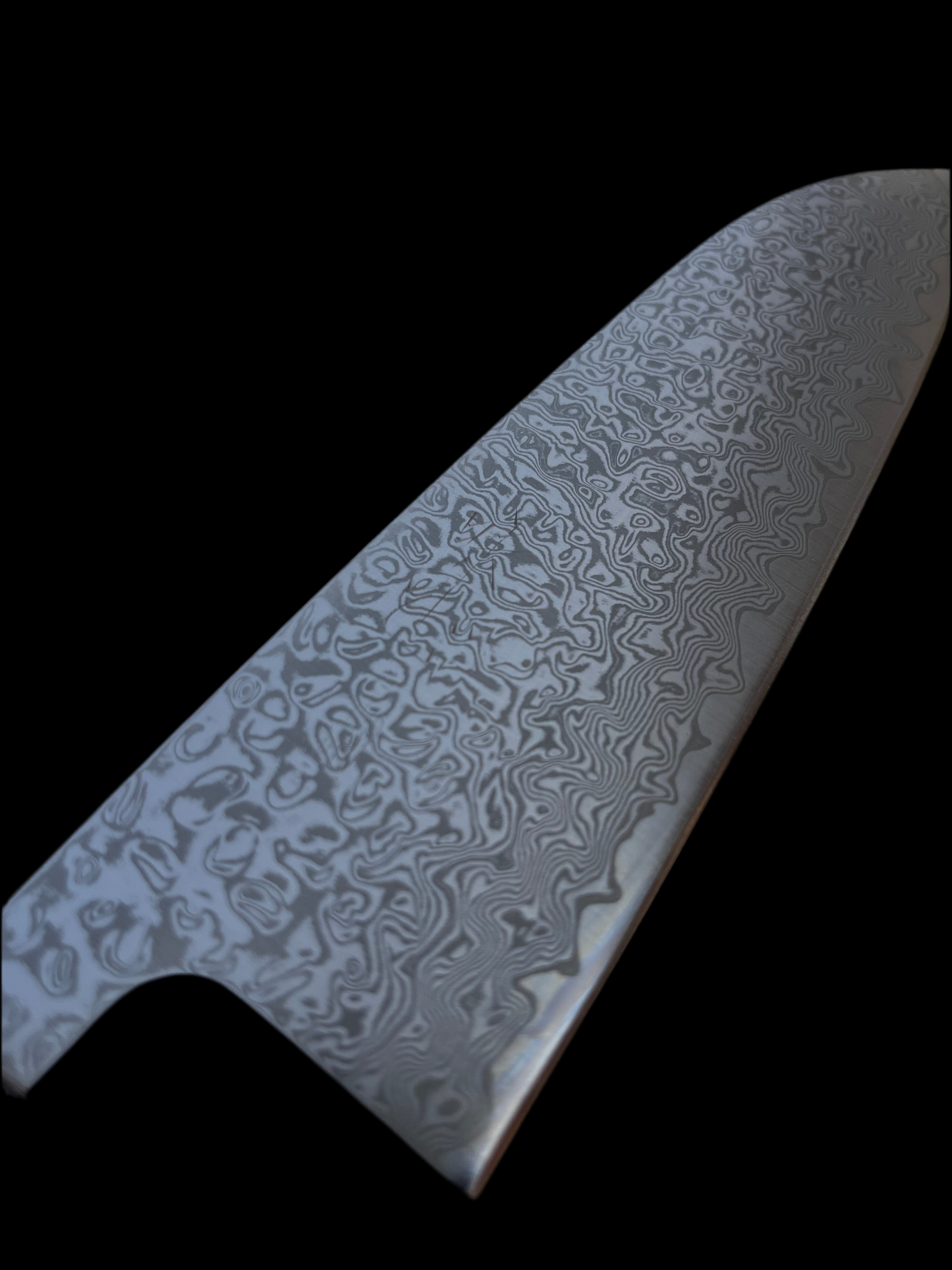 Tento elegantní a funkční japonský Santoku nůž byl ručně vyroben v oblasti Sakai, která je proslulá svou dlouhou tradicí výroby kuchyňských nožů. Čepel je tvořena z 67 vrstev damaškové oceli, s jádrem z nerezové oceli AUS10, která je ceněná pro svou tvrdost, odolnost a vynikající ostrost. Tato kombinace vytváří nejen funkčně výborný, ale i vizuálně atraktivní nůž s jedinečným vzorem na čepeli.